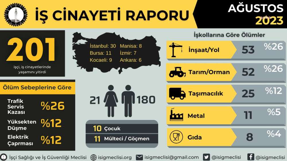 İşçi Sağlığı ve İş Güvenliği Meclisi'nin (İSİG), Ağustos 2023’te 201 emekçinin daha iş cinayetlerinde yaşamını yitirdiğini, yılın ilk 8 ayında ölen emekçi sayısının 1255 olduğunu bildirdi. İSİG, yoksulluğun iş cinayetlerini artırdığına dikkat çekerek, “Bugün asgari ücret Türkiye işçi sınıfının çoğunluğunun ortalama maaşı haline gelmiştir. Şirket ciro ve karları ise rekor kırmaktadır. Her iş kolunda ve şehirde patronlar karlarına kar katmakta bu durum da yoksullaştırma, işçileştirme ve güvencesiz çalıştırma ekseni üzerinden olmaktadır" açıklamasını yaptı.